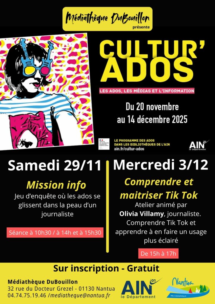 L’événement organisé par le Département de l’Ain arrive dans votre Médiathèque ! Un programme rien que pour les ados.